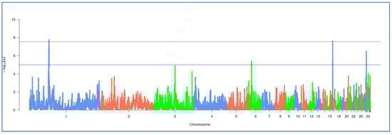Search for signatures of selection in genomes of the studied breeds as revealed by the hapFLK analysis. Chicken autosomes are the values for the X-axis, and statistical significance values (−log10 p-values) are the values for the Y-axis. The red line that indicates the threshold of significance at p < 2.8 × 10−8 (i.e., −log10(p) > 7.55) was determined using the Bonferroni correction and defines the strongest hapFLK regions, while the blue line indicates the threshold of significance at p < 1 × 10−5 (i.e., −log10(p) > 5) and defines the putative hapFLK regions.