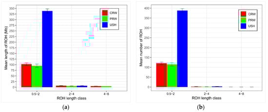 At the same time, the distribution analysis of the average length (Figure 4a) and the number of homozygosity segments by length class (Figure 4b) showed that USH, like two other studied breeds, are distinguished mainly by shorter segments, suggesting events of longstanding inbreeding. Herewith, the values of these indicators for USH significantly exceeded similar values for other breeds in the shortest length class; however, as the length of the ROH fragments increases, USH was inferior to CRW and PRW. Thus, the longest (4–8 Mb) fragments were not identified for USH at all, while the average length of fragments of this class for CRW and PRW was 4.94 and 4.26 Mb, respectively (Figure 4a,b, Supplementary Table S4a,b).