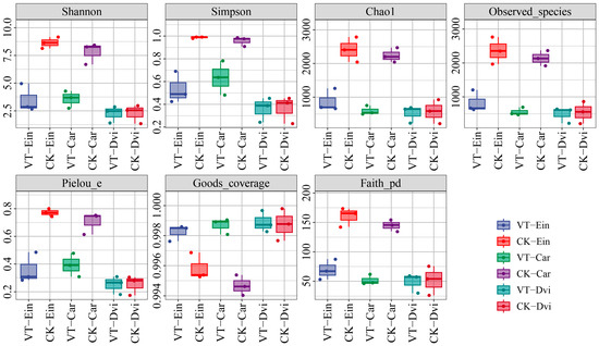 Box diagram of the differences in the α diversity indices of endogenous root bacteria between different samples. Colored dots represent values that are significantly different from other data in this group. VT-Dvi, Dodonaea viscosa in VTM mining area; VT-Car, Carex in VTM mining area; VT-Ein, Eleusine indica in VTM mining area; CK-Dvi, Dodonaea viscosa in non-VTM mining area; CK-Car, Carex in non-VTM mining area; CK-Ein, Eleusine indica in non-VTM mining area.