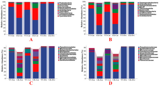 By examining the abundance of the top 10 phyla, differences among the samples were assessed (Figure 2A). Proteobacteria, the dominant phylum in the samples, was found to make up an average of 74.36% of the total bacteria, followed by Actinobacteria (20.19%), Firmicutes (3.44%), and Bacteroidetes (0.63%). Among all the samples, Proteobacteria (95.61% on average) was the predominant phylum in the CK-Dvi sample, Actinobacteria (41.23% on average) dominated the CK-Ein sample, while Firmicutes (14.83% on average) and Bacteroidetes (1.35% on average) were the most abundant in the CK-Car sample. Compared to the CK-Ein sample, there was a notable boost in the abundance of Proteobacteria within the VT-Ein samples (p < 0.05), whilst a considerable decrease in the quantity of Actinobacteria was observed (p < 0.05). Besides, the abundances of Firmicutes and Bacteroidetes decreased, but not significantly. A notable change was observed in the abundance of Proteobacteria in the VT-Car sample, which demonstrated a significant rise compared to the CK-Car sample (p < 0.05). Furthermore, the abundance of Bacteroidetes in the VT-Car sample was significantly reduced compared to the CK-Car sample (p < 0.05). Besides, the abundances of Actinobacteria and Firmicutes were decreased in the VT-Car sample, but not significantly. While a drop in the abundance of Proteobacteria was observed in the VT-Dvi sample compared to the CK-Dvi sample, this difference was not found to be statistically significant. Additionally, the abundances of Actinobacteria, Firmicutes, and Bacteroidetes were increased, but not significantly.