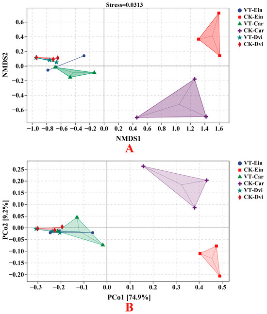 β diversity analysis of the root endophytic bacterial community in different samples based on NMDS (A) and PCoA (B). VT-Dvi, D. viscosa in the VTM mining area; VT-Car, Carex in the VTM mining area; VT-Ein, E. indica in the VTM mining area; CK-Dvi, D. viscosa in the non-VTM mining area; CK-Car, Carex in the non-VTM mining area; CK-Ein, E. indica in the non-VTM mining area.