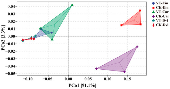 PCoA of the functions of the root endophytic bacteria predicted by PICRUSt2. VT-Dvi, D. viscosa in the VTM mining area; VT-Car, Carex in the VTM mining area; VT-Ein, E. indica in the VTM mining area; CK-Dvi, D. viscosa in the non-VTM mining area; CK-Car, Carex in the non-VTM mining area; CK-Ein, E. indica in the non-VTM mining area.