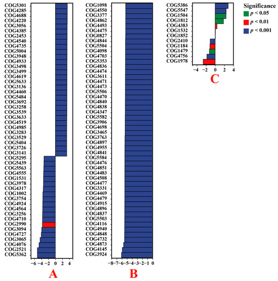 Based on the COG database, the functions of endophytic bacteria in plant roots were significantly different between VTM mining areas and non-VTM mining areas. The vertical axis represents the ID of the COG, the horizontal axis represents the log2-fold change, and different colors indicate significant differences between samples at different levels. (A) VT-Ein vs. CK-Ein; (B) VT-Car vs. CK-Car; (C) VT-Dvi vs. CK-Dvi.