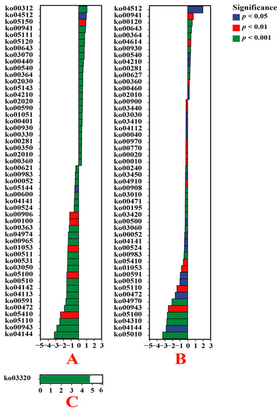 Based on the KO database, the functions of endophytic bacteria in plant roots were significantly different between VTM mining areas and non-VTM mining areas. The vertical axis represents the ID of the KO, the horizontal value is prelog2 (fold change), and different colors indicate significant differences between samples at different levels. (A) VT-Ein vs. CK-Ein; (B) VT-Car vs. CK-Car; (C) VT-Dvi vs. CK-Dvi.