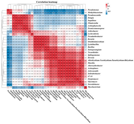 Pearson correlation analysis revealed significant interactions among the 30 most abundant genera of plant root endophytic bacteria from the VTM mining area (Figure 10). Positive correlations were observed between Altererythrobacter, Actinoplanes, Asticcacaulis, Solirubrobacter, 67–14, and Nocardioides (p < 0.05). Moreover, Dongia, Inquilinus, Flindersiella, Actinophytocola, Promicromonospora, and Pseudonocardia were also found to be positively correlated (p < 0.05). On the other hand, negative correlations were observed between Bacillus, Intrasporangium, Nocardioides, Sphingomonas, Devosia, Allorhizobium-Neorhizobium-Pararhizobium-Rhizobium, Massilia, Altererythrobacter, and Pseudomonas. Additionally, Nocardioides, Devosia, Steroidobacter, and Methylobacterium were also negatively correlated (p < 0.05). The study illustrated a significant interplay evident among the primary cohorts of endophytic bacterial communities active within plant root systems.