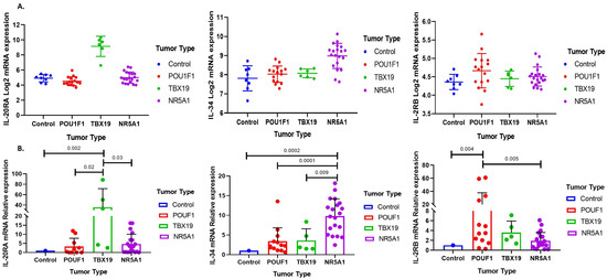 Characteristic immune-related gene expression in pitNET. (A) Immune response genes filtered for each pitNET lineage. IL20RA, IL-34, and IL2RB were chosen for TBX19-, NR5A1-, and POU1F1-derived pitNET, respectively. The expression values shown were obtained from whole transcriptome data. The y-axis depicts the log2 mRNA expression, and the x-axis, the pitNET tumor type. (B) Validation of the selected genes characteristic of each pitNET lineage using real-time PCR; the y-axis represents the relative mRNA expression and the x-axis, the type of tumor. Statistical comparison was performed using a Mann–Whitney U test. All p values < 0.05 were considered statistically significant. The image was generated using the GraphPad Prism 7 program.