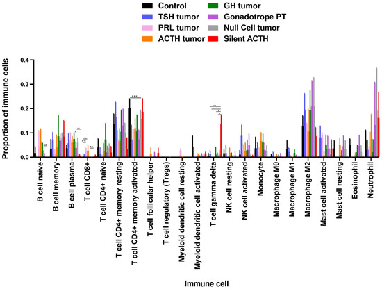 Immune cells potentially infiltrating PitNET. Deconvolution analysis depicting the proportions of immune response cells potentially infiltrating pitNET. The y-axis depicts the proportions of cells in the tumor immune microenvironment, while the x-axis represents the type of immune cells analyzed by the CIBERSORT algorithm. The analysis reveals a higher proportion of infiltrating immune cells in pitNET compared to non-tumoral pituitary tissue. These include CD4 +T cells, CD8 +T cells, NK cells, M2- macrophages, and neutrophils. Statistical analysis was conducted using the Mann–Whitney U test, a p value < 0.05 was considered statistically significant; p < 0.05 (*), p < 0.01 (**), p < 0.001 (***). The image was generated using the GraphPad Prism 7 program.