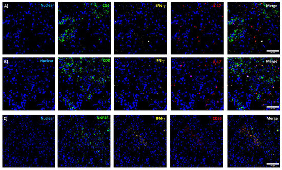 Immune cell infiltrates in pitNET. Specific immune cells visualized by immunofluorescence using antibodies against CD4, IFN-ɣ, CD8, IL-17, NKP46, and CD56. CD4+ T, CD8+ T cells, and NK cells are depicted in panels (A), (B), and (C), respectively.