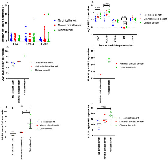 (A) Differential expression of genes encoding IL-34, IL-20RA, and IL-2RB among no clinical benefit, minimal benefit, and clinically significant benefit from ICi. (B) Upregulation of HLA, HLA-B and PD-1 in CNF pitNET. (D) Genes that could help us identify PitNET that may clinically benefit from treatment with ICi: (C) CCL18 for ACTH-secreting tumors, (D) IRAK3 in TSH-secreting PitNET, (E) IL-5RA for GH-secreting PitNET and (F) HLA-B for CNF PitNET. Green color depicts all tumors that could have benefited from ICi treatment, red color depicts all tumors that could have minimal benefit from ICi treatment, and blue color depicts all tumors that do not have any benefit from ICi treatment. Figures obtained using the GraphPad Prism 7 program.