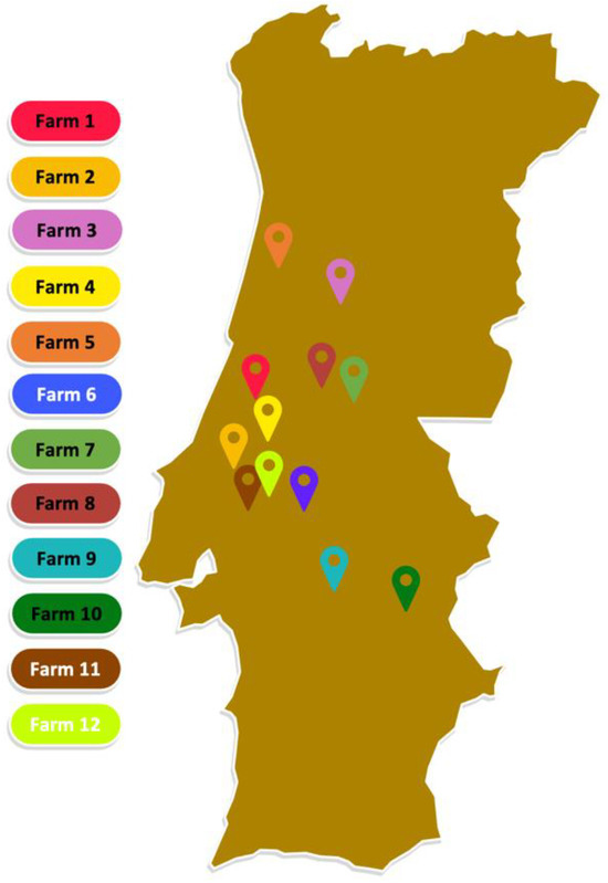 A total of 213 samples were collected from healthy pigs from twelve farms across the center of Portugal from January to October 2021 (Figure 1). Fourteen samples were collected from each farm, with the exception of farm 12, from which only 13 samples were collected. Samples were collected with a nasal and mouth swab (one sample per individual). Of the 12 farms, seven were exclusively breeding pig farms, two were exclusively fattening pig farms, and three were both breeding and fattening farms. In addition, all breeding pig farms included nurseries. Among the 213 pigs sampled, 100 were breeding sows, 60 were fattening pigs, and 53 were piglets.