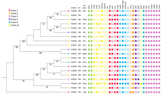 The sequence type (ST) along with the clonal complex (CC) were identified in all isolates. All strains belonged to ST398, which is grouped in CC398. spa-typing revealed diversity within the isolates, with six distinct spa types identified: t011 (n = 10), t1451 (n = 4), t4208 (n = 2), t1456, t1184, and t108. Notably, strain VS3292 harbored a unique, yet to be officially curated, spa type.