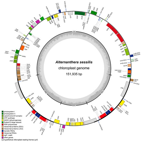 The analysis of inverted repeat regions (IRs) within the A. sessilis cp genome was conducted using GeSeq [30] (https://chlorobox.mpimp-golm.mpg.de/geseq.html, accessed on 18 January 2024). Verification of the large single copy region (LSC), small single copy region (SSC), and IRs was performed using Geneious 10.1 [31]. Visualization of the structure of the A. sessilis cp genome was achieved using OGDraw [32] (https://chlorobox.mpimpgolm.mpg.de/OGDraw.html, accessed on 18 January 2024).