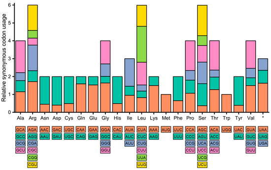 Codon usage bias is a widespread phenomenon observed across various species and stages of life. This bias is considered a result of long-term evolution and is influenced by multiple factors, with directional mutation and neutral selection being primary contributors [33,34]. Relative synonymous codon usage (RSCU), a commonly employed parameter for studying codon usage bias, represents the ratio between actual and expected codon occurrences. It aids in the analysis of gene function and evolutionary patterns. An RSCU value of 1 signifies no codon bias, while values greater than 1 indicate a higher occurrence of a codon compared to other synonymous codons, and vice versa. The RSCU values for the cp genomes of A. sessilis and A. philoxeroides were calculated using the protein-coding genes from these cp genomes. This analysis was performed using codon usage analysis in MEGA 11.0 [35].