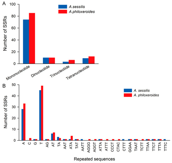 Number of simple sequence repeats in A. sessilis and A. philoxeroides chloroplast genomes. (A) Number of simple sequence repeats of different types in A. sessilis and A. philoxeroides chloroplast genomes based on the repeating motif length. (B) Number of simple sequence repeats with different motif types in A. sessilis and A. philoxeroides chloroplast genomes.