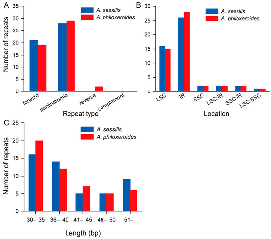 Number of repetitive sequences in A. sessilis and A. philoxeroides chloroplast genomes. (A) Number of repetitive sequences of different types in A. sessilis and A. philoxeroides chloroplast genomes. (B) Number of repetitive sequences in different locations in A. sessilis and A. philoxeroides chloroplast genomes. (C) Number of repetitive sequences of different lengths in A. sessilis and A. philoxeroides chloroplast genomes.