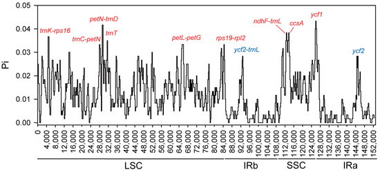 The nucleotide polymorphism for cp genomes of A. sessilis and A. philoxeroides calculated using DnaSP 6.0 employing parameters of a 200 bp step size and 600 bp window length. Eleven most divergent regions are suggested as mutation hotspots. The name of regions in red indicate these regions are located in LSC region or SSC region, and those in blue indicate the regions are located in IRs.