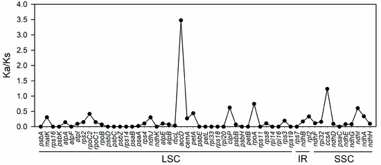 The Ka/Ks ratio of 55 protein-coding genes in A. sessilis and A. philoxeroides calculated using DnaSP 6.0. Ka/Ks values of AccD and CcsA were more than 1.