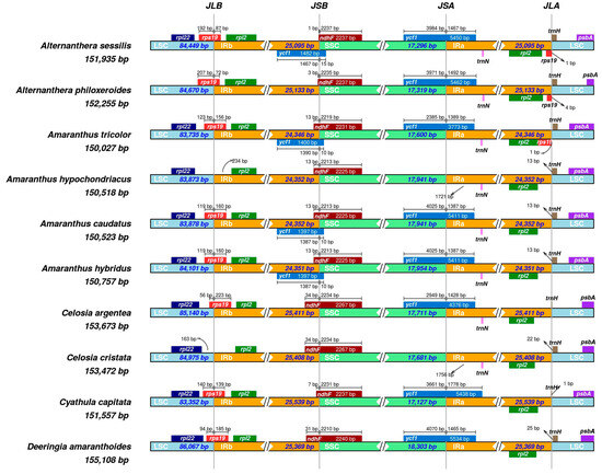 Comparison of the border positions of the LSC, IR, and SSC regions among ten Amaranthaceae species chloroplast genomes. Gene names are indicated in the boxes and their lengths in the corresponding regions are displayed above the boxes.