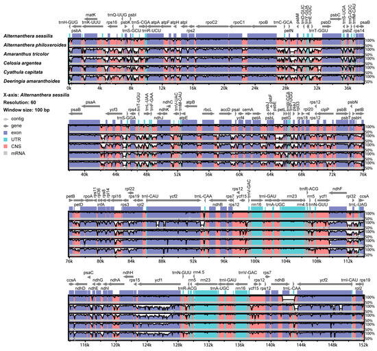 Using the annotation of the A. sessilis cp genome as a reference, a comprehensive comparison was conducted with the cp genomes of other Amaranthaceae species using mVISTA [45] (http://genome.lbl.gov/vista/mvista/submit.shtml, accessed on 18 January 2024). This analysis aimed to assess the distinctions between their respective cp genomes.