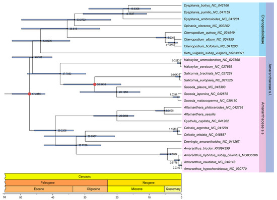 The time tree estimated under the local molecular clock using the RelTime-ML method in MEGA 11.0. The circular representation with full red indicates the divergence times of the Amaranthus and Chenopodium genus (estimated at 24.5–73.8 MYA) as well as the Suaeda and Salicornia genus (estimated at 12.1–39.7 MYA), derived from 10 studies and 5 studies, respectively, in TimeTree, used for estimating the divergence time between A. sessilis and A. philoxeroides.
