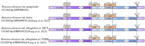 Four B. oleracea varieties were selected for boundary analysis between the LSC, IR and SSC regions in the cp genome: the newly assembled cp genome of B. oleracea var. gongylodes (MW900251, 153,364 bp), B. oleracea var. alboglabra cv. SJCT (OR063915, 153,365 bp) [15], B. oleracea var. alboglabra cv. FZHH (OR063916, 153,420 bp) [15] and B. oleracea var. itaica (MN649876.1, 153,364 bp) [23] (Figure 6). The lengths of the IR and SSC regions were the same in these four B. oleracea varieties. Only the length of LSC region was different, and ranged from 83,136 to 83,192 bp. The rps19 coding sequence was located in the boundary of the LSC and IRb region and the relative location was same in these four B. oleracea varieties at 113 bp upstream of the IRb region. The ndhF and ycf1 coding sequences were located in the boundaries of the IRb and SSC region and SSC and IRa region at 2204 bp upstream of the SSC region and 1027 bp upstream of the IRa region, respectively. The tRNA non-coding gene trnH-GUG in these four B. oleracea varieties was within the LSC region, which started 3 bp upstream of LSC in B. oleracea var. gongylodes, B. oleracea var. alboglabra cv. SJCT and B. oleracea var. alboglabra cv. FZHH, and 4 bp upstream of LSC in B. oleracea var. itaica. These results suggested that the boundaries between the LSC, IR and SSC regions were highly conserved except for minor differences in distance of trnH-GUG at the boundary between the IRa and LSC regions in B. oleracea varieties.