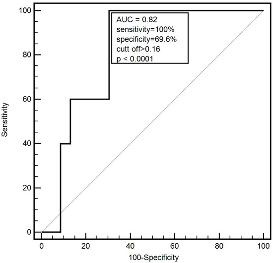 Before the commencement of RT (week I), expression level of miR-5682 allowed to distinguish between patients demonstrating simultaneous presence of SGA-C score and plasma albumin concentration <3.2 g/dL and other LC individuals with 100% sensitivity and 69.6% specificity (AUC = 0.820; cut-off > 0.16; p < 0.0001) (Figure 1).