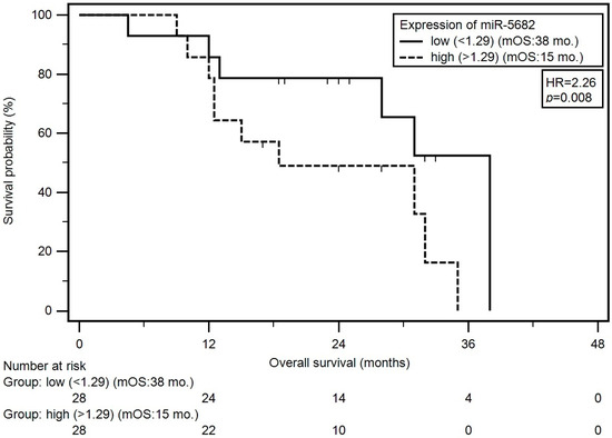 The univariate survival analysis (Kaplan–Meier log-rank test) demonstrated that patients with N > 1 category and LC individuals with the M1 category had a significantly higher (approximately 5.5- and 15-fold, respectively) risk of an early death incidence (HR = 5.49; p = 0.006 and HR = 14.54; p < 0.001, respectively) compared to other patients. Moreover, patients with a high expression level of miR-5682 had significantly shorter median overall survival (OS) in contrast to the individuals demonstrating low miRNA expression (median OS: 38 months vs. 15 months; HR = 2.26; p = 0.008) (Figure 2). The multivariate analysis (Cox proportional hazard model) selected N > 1 stage (HR = 19.13; p = 0.013), C-RT (HR = 8.65; p = 0.016) and a high miR-5682 expression level (HR = 3.82; p = 0.012) were unfavorable dependent factors affecting patients’ survival. The results for overall survival analysis including univariate and multivariate model are presented in Table 5.