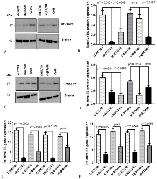 The impact of E6 and E7 shRNAs on the mRNA expression of HPV16 E6 and E7, assessed through RT-PCR, and their effect on protein expression analyzed via Western blot analysis (WB) after 24 and 48 h for treated and control (C) samples for: HPV16 E6 (A) and HPV16 E7 (C), densitometry analysis for E6HPV16 protein (B) and E7HPV16 protein (D), and relative gene expression by qRT-PCR of HPV16E6 (C, Cj—control joint) (E) and HPV16E7 (F). *—p < 0.05; **—p < 0.01; ***—p < 0.001; ****—p < 0.0001; ns—p > 0.05.