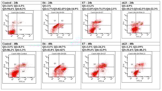 Flow cytometric analysis of cell viability and apoptosis processes in CaSki cells treated with shE6RNA, shE7RNA, shj23RNA, and untreated, after 24 and 48 h. The results are presented after the acquisition of data by flow cytometry (Q1 = necrosis, Q2 = late apoptosis, Q3 = viable cells, Q4 = early apoptosis).