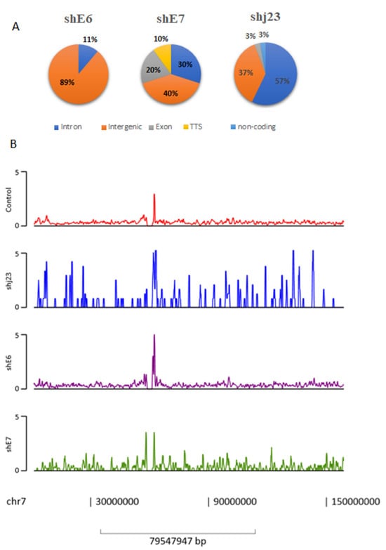 Enriched regions for MBD2 and MBD3 were called with default parameters using DNA input as control and retaining all statistically enriched regions (FDR < 1%). Peaks were annotated with nearby genes or genomic features using HOMER. MBD2, MBD3-NuRD peaks were numerous at intergenic enhancers, intronic sites, exon region, gene promoters, and TSS. As we observed in Figure 4, shRNA E6 treatment determines deposition of NuRD complex at the intergenic region (89%) in particular, while for shj23, NuRD deposition is in the intron region (57%). Interestingly, shRNA E7 treatment determines NuRD deposition to intergenic regions (40%) and also in intron (30%) and exon (20%) regions, along with TSS (10%). We also included, as a representative image, the peak distribution along chromosome 7, where one of the most important genes (miR-490) from our study was found (Figure 4).