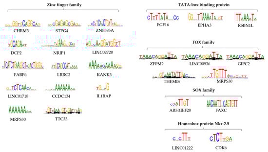 Differential motif analysis with HOMER was performed to identify short sequences that are over-represented in target sequences compared to background. Based on this analysis, we identified binding sites specific for transcription factors (TFs), regarding the selected genes (Figure 6, Supplementary Table S5). One of the highest scoring recurring motifs is bound to the TATA box binding protein, which was encountered next to the following genes: FGF16, EPHA3, and RSBN1L. Transcription factor IID (TFIID) is an important factor that coordinates the initiation of RNA polymerase II transcription and that binds to the core promoter, positioning the polymerase and serving as a scaffold for complex assembly [20]. Another important mention involves multiple members of the zinc finger family of transcription factors, these motifs ranking among the highest for the following genes: C16orf78, ZNF585A, DCP2, NRIP1, LOC101928446, FABP6, LRRC52, KANK3, LINC01718, CCDC134, and MRPS30. The most common zinc finger members encountered are ZNF384 and ZNF304. Although not the highest scoring, the SOX family of genes was also well represented as a target for the motifs found, with SOX15 and SOX8 as worthy mentions, related to ARHGEF28 (SOX15) and FAXC (SOX8) genes. The SOX (SRY-Box Transcription Factor) family is taking part in the control of embryonic development, proliferation, and migration regulation. There are no reported data regarding the involvement of SOX8 in cervical cancer, but Xie et al. reported a positive association between high SOX8 expression and a high rate of tumor metastasis in tongue squamous cell carcinoma [21]. One other reoccurring family of genes is comprised of forkhead box proteins, which were observed as targets for the motifs next to the following genes: MRPS30 and FAT1–FOXO1; ZFPM2, LINC00936 and GIPC2–FOXJ2; THEMIS–FOXB1. The forkhead family of transcription factors (FOXO) was also noted, being involved in promoting multiple cellular processes such as cycle arrest and apoptosis. ELF3 (E74 Like ETS Transcription Factor 3) is another factor involved in downregulation of DNA-templated transcription and upregulation of transcription by RNA polymerase II. Homeobox protein Nkx-2.5 was also found as a target for motifs encountered for LINC01222 and CDK6. The results highlighted a propensity towards motifs that bind transcription factors involved in key cellular processes such as apoptosis and cell proliferation, immune response and cell cycle arrest, pathways known to be heavily affected in the cancer pathology. These results indicate a much more subtle oncologic process, with many more host gene expressions affected by the HPV16 E6 and E7 oncogenes.