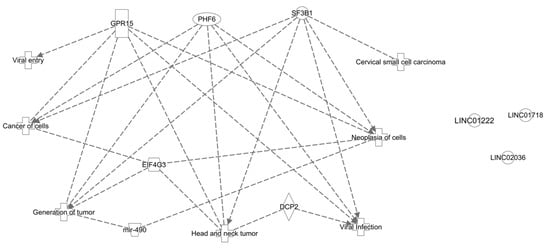 To create a custom pathway, we included in our dataset list the following genes: PHF6, SF3B1, EIF4G3, GPR15, DCP2, miR-490, LINC01222, LINC01718, and LINC02036. When building the network, it was observed that all genes were identified in the QKB database, except the LINCs. When running the “Grow to Disease and Functions” feature, 163 most significant diseases and functions resulted. From those, we selected the most important ones in cancer oncogenesis, viral infection, or squamous cell carcinoma context (Figure 9).