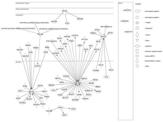 When performing the "Grow to Canonical Pathways” tool, we selected only molecules or pathways that include “Cancer”, together with “Infectious Disease”, “Reproductive Disease System” diseases, and “Human” species. The results displayed 38 molecules for the SF3B1 protein with localization in cytoplasm (n = 18) and nucleus (n = 20). The molecules were classified according to their function in: transcription regulators (TP53, BRCA1, MDM31, BCLAF1, SAP30BP, BUD31, RAD21, RBM39, TCERG1), translational regulators (EIF4E, CELF1), enzymes (SMC1A, SMC3, MDM2, PHGDH, UQCRC2, PDHA1, NDUFB8, MT-CO2, G6PD), transporters (ATP5F1A, MCL1), kinases (PRKCI, CHEK1), complexes (PI3K complex, Histone.h3, CDK11, Cyclin E), and others (GRB2, BCL2L1, FANCD2, FANCI, PHF5A, PUF60). For the DCP2 gene, 17 molecules with localization in cytoplasm (n = 6) and nucleus (n = 11) were displayed. Their functions were classified in: enzymes (DDX6, DDX17, PSMC3, EXOSC4, TRIM21, UPF1, XRN2, NDUFB7, NDUFS8, PPIB, HMOX2), transcription regulators (BICRA, EDF1, RUVBL2), translation regulator (AGO2), and others (DCP1A, NDRG3). Of the eight molecules found for the EIF4G3 protein, four were located in cytoplasm and four in the nucleus. Their categorization based on their function was: two translational regulators (EIF4A1, PABPC1), two transcription regulators (FUS, CTNNB1), and one of the following categories: enzyme (SUZ12), complex (26S proteasome), peptidase (UCHL1), and other (NEAT1). For PHF6 and GPR15, proteins were displayed three molecules each. The PHF6 ones were found in the nucleus, two of them with the function of transcription regulators (H2AX, UBTF) and one as an enzyme (POLR2A). On the contrary, the GPR15 ones were found in cytoplasm, two of them being transporters (SEC23A, SEC24D) and one being a complex (14-3-3). Of the four targets of miR-490, three of them are located in cytoplasm, and as a function they are mature microRNA (miR-490-3p, miR-490-5p and miR-346), while one was located in nucleus, being a transcription regulator (FOXP3). No molecules were found for the other genes. We also observed that EIF4E is a common target for both EIF4G3 and SF3B1 factors (Figure 10).