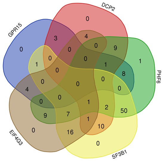 Using the “Path Explorer” tool helped identify the shortest path between inserted nodes. We used this tool to build up custom literature-supported signaling pathways starting with the same set of genes, when defining in the set-up menu Set A and Set B. Moreover, we selected the same parameters to include “Cancer”, “Infectious Disease”, and “Reproductive Disease System” diseases. Thus, we obtained 265 pathways that linked the molecules between them. The pathways were classified according to their type of relationship in: 187 protein–protein interaction, 7 protein–RNA interaction, and 71 RNA–RNA interaction (microRNA targeting). We designed a Venn diagram that illustrates the number of overlapping and distinct factors. The most common factors were found between PHF6 and SF3B1 proteins (n = 50), followed by SF3B1 and EIF4G3 (n = 16). When intersecting PHF6, SF3B1, and EIF4G3 proteins, seven common targets were observed (MYCN, NAA40, NTRK1, PRKN, STAU1, TRIM67, ESR1). Only one target, PLEKHA4, was displayed after intersecting DCP2, EIF4G3, PHF6, and SF3B1 proteins. No common factors were found when overlapping all five proteins (Figure 11).