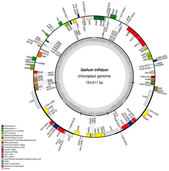 The genomic library was constructed with a TruSeq Nano DNA kit (Illumina, San Diego, CA, USA) and was sequenced using HiSeqX (Illumina) to generate 150 bp paired-end reads at Macrogen Inc. (Seoul, Republic of Korea) with a 350 bp insert size between paired ends. The raw reads were evaluated by a Trimmomatic 0.39 tool [17] in the quality check process with following parameters: PHRED score > 20, a 150 bp trimmed sequence length, number of Ns < 1%. The filtered reads were transferred to the de novo plastome assembly of two G. trifidum isolates (ID1 and ID2) and two G. palustre isolates (ID1 and ID2). The assembly was performed by NOVOPlasty 4.3 software [18] with default settings and rbcL gene as the seed. The NOVOPlasty software enables the de novo assembly of short circular genomes. Meanwhile, raw reads of G. odoratum and G. verum were downloaded from the Sequence Read Archive (SRA) and also assembled with NOVOPlasty (Table S1). In the next steps, the assembly of all plastomes was verified manually in Geneious Prime 2023.2.1 (Biomatters, Auckland, New Zealand), which allowed us to conduct a comprehensive sequence analysis (visualisation, alignment, annotation editing, and mapping). The circular sequence of each genome was remapped by the Geneious Prime 2023.2.1 mapping algorithm with custom parameters (minimum overlap = 80 bp and minimum overlap identity = 96%). After full plastome completion, the sequences were annotated according to G. aparine (NC_036969.1; chloroplast NCBI record) with the support of the Transfer Annotation option in the Geneious Prime 2023.2.1 software.