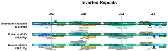Visualising the boundaries of chloroplast genome junction sites can reveal general differences between species or genera (Figure 2). In the case of Leptodermis scabrida, junction site B (between the LSC and IRB regions) is located 13 bp from the rps19 gene located in LSC, while in the remaining sequences, the boundary is located within the rps19 gene. Another distinction is observed between the IRB and SSC regions in L. scabrida where the boundary is located within the ndhF gene (76 bp belongs to the IRB region and 2207 bp to the SSC). In G. trifidum, JSB (the junction site between IRB and SSC) is located 29 bp from the beginning of the ndhF gene, while in Rubia cordifolia, it is only 3 bp from the start. In the case of L. scabrida, JSB is located outside of the ycf1 gene. It is worth noting that the trnH gene in L. scabrida is located in the IR regions. The trnH gene of the remaining species is located in the LSC region, 27 bp from the JLA (junction site between LSC and IRA regions) in the case of R. cordifolia, and 13 bp in the case of G. trifidum.