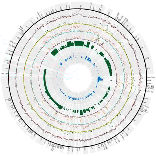 - Greiner, S.; Lehwark, P.; Bock, R. Organellar Genome DRAW (OGDRAW) Version 1.3.1: Expanded Toolkit for the Graphical Visualization of Organellar Genomes. Nucleic Acids Res. 2019, 47, W59–W64. [Google Scholar] [CrossRef] [PubMed]