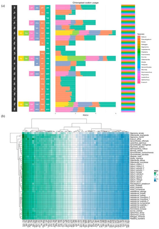 The relative synonymous codon usage (RSCU) plot (Figure 4a, Table S14) shows preferences of codon usage in different genera. Clear changes are observed, e.g., in valine (Val), where the GTA codon is more preferred than the GTC codon in Galium and Pseudogalium species. This trend is slightly different in other genera, especially Exacum, Ophiorrhiza, Lasianthus, and Psychotria, where they clearly use more GTC codons than Galium and Pseudogalium, simultaneously decreasing the number of GTA codons in exons. On the other hand, the RSCU heatmap (Figure 4b) shows that valine has similar GTA usage across all species included in the analysis, which may indicate that this difference is not significant. The heatmap is useful for presenting the preference of some triplet usages that might be overlooked in Figure 4a. For example, most species prefer the TTA codon for leucine (Leu) over other codons, as shown in the heatmap. Oldenladnia brachypoda and Saprosma merrilli are particularly prominent in their usage of TTA. Additionally, plants belonging to the Rubieae tribe exhibit a greater preference for TTA than those in the Paederieae tribe.