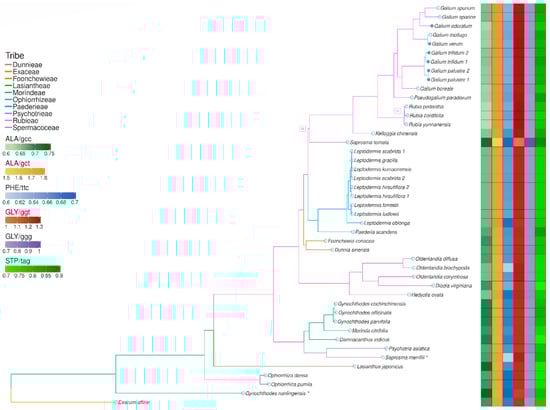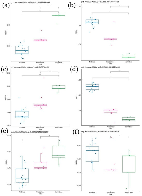 The statistical analysis showed significant differences between Rubieae and Morindeae in the codons GCC, GCT, TTC, GGT, and GGG (Figure 6a–e, Table S15). None of these codons showed statistical differences between Rubieae and Paederieae, but all codons significantly differed between Paederieae and Morindeae. The TAG codon is very interesting because the RSCU value is very dynamic between genera, so a larger number of genera in Rubieae and Morindeae may influence the evolutionary trend shown by RSCU, making this trend random (Figure 6f).