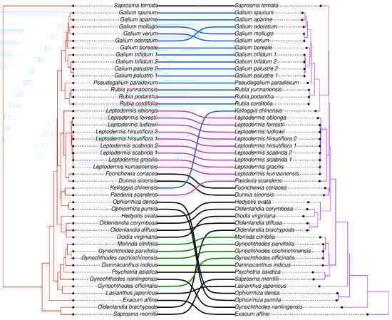Comparison of tree based on RSCU (red tree) and a phylogenetic tree based on whole chloroplast genomes (purple tree). Lines between trees connect names of the same species to show the difference in the trees’ topology. Blue lines connect species from the tribe Rubieae, pink lines connect species from the tribe Paederieae, and green lines connect species from the tribe Morindeae. Black lines connect species that were not used in the RSCU comparison with phylogenetic relationships.