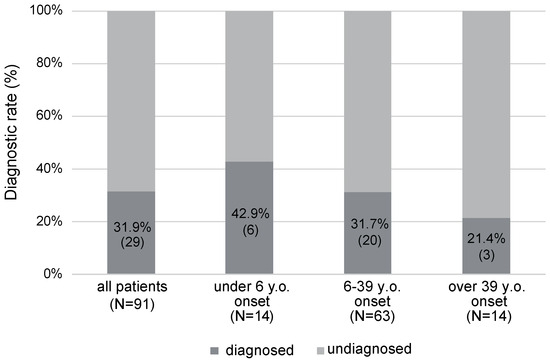 Based on the results of the next-generation sequencing analysis, we diagnosed 29 probands among the 91 participants, with the diagnostic rate for this study cohort being 31.9% (Figure 1). The diagnostic rate was highest in the congenital/early-onset group (42.9%), followed by the juvenile/young adult-onset group (31.7%), and the middle-aged/aged-onset group (21.4%) (Figure 1).