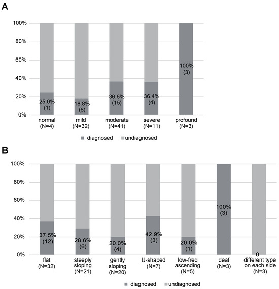 The diagnostic rates by severity and type of HL. (A) Diagnostic ratio for each severity of HL. (B) Diagnostic rate of for each audiometric configuration.