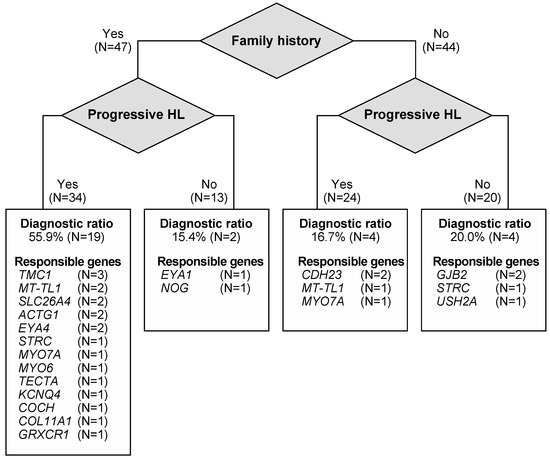 Interestingly, family history and progressive HL appear to be good markers for a higher diagnostic ratio. In this study, a higher diagnostic ratio was achieved in 19 (55.9%) of 34 patients with both a family history and progressive HL, even though most of these cases had late-onset mild-to-moderate HL. Among these 19 cases, 13 cases were diagnosed with autosomal dominant inheritance gene-associated HL, and 3 cases were diagnosed with maternal inheritance. In general, autosomal dominant non-syndromic HL is considered to be associated with post-lingual-onset, progressive HL [12], and our results were consistent with this hypothesis.