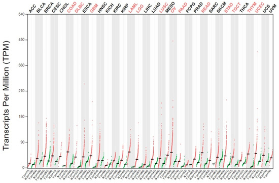 - Tang, Z.; Li, C.; Kang, B.; Gao, G.; Li, C.; Zhang, Z. GEPIA: A web server for cancer and normal gene expression profiling and interactive analyses. Nucleic Acids Res. 2017, 45, W98–W102. [Google Scholar] [CrossRef]