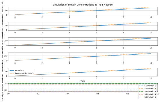 Figure 18 illustrates the sensitivity analysis conducted by perturbing rate constants with 10% random noise. Solid lines depict original concentrations, while dashed lines represent perturbed concentrations, exploring the impact of rate constant changes on protein concentrations. This analysis helps assess the robustness of the TP53 network to variations in kinetic parameters, providing insights into its stability and responsiveness to external stimuli.