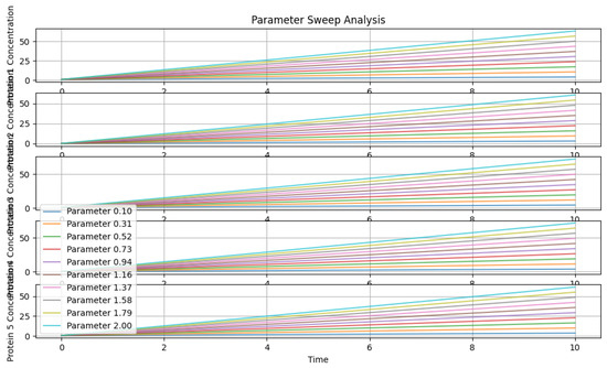 In Figure 19, a parameter sweep analysis was performed by varying values from 0.1 to 2.0, scaling rate constants. Subplots display protein concentration profiles for different parameter values, revealing the system’s sensitivity to parameter changes. This analysis elucidates how alterations in kinetic parameters affect the behavior of the TP53 network, offering crucial information for understanding its regulatory mechanisms and potential therapeutic interventions.
