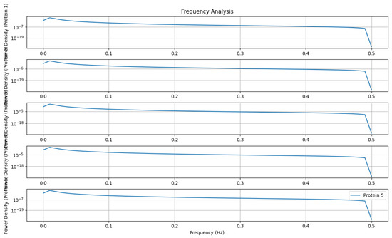 Figure 20 presents a frequency analysis that calculates power spectral density using the Welch method. Subplots display power density spectra for specific proteins, helping identify dominant frequencies in protein concentration signals. This analysis enables the characterization of temporal dynamics within the TP53 network, uncovering oscillatory patterns and regulatory motifs that govern its activity.