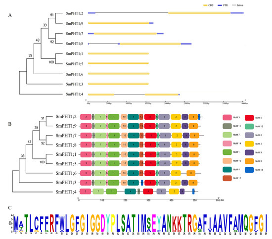 Conserved motifs and gene structures of the SmPHT1 in S. miltiorrhiza. (A) Gene structures. The yellow boxes indicate exons, the blue boxes indicate untranslated 5′ and 3′ regions, and the black lines indicate introns. (B) Motif composition. The motifs are displayed in different colored boxes. The sequence information for each motif is provided in Table S3. (C) Visualization of motif 1.