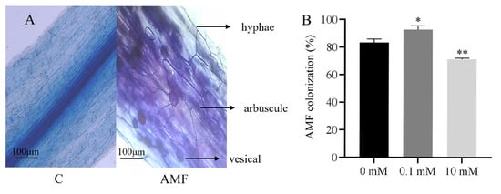 To investigate the symbiotic relationship between AMF and the roots of S. miltiorrhiza under different P concentrations, mycorrhizal colonization was analyzed. In the absence of AMF, the mycorrhizal colonization structure of S. miltiorrhiza was not established (Figure 3A). After inoculation with AMF, the colonization rate was greater at 0.1 mM P than 0 mM and 10 mM P (Figure 3B). These results indicated that a P concentration of 0.1 mM significantly increased the colonization rate of the AMF.