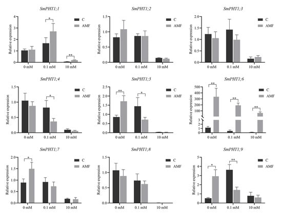 To further investigate the functional role of SmPHT1 genes in S. miltiorrhiza, their expression levels were examined in S. miltiorrhiza roots inoculated with AMF under different P concentrations (Figure 6). First, with increasing P concentration, there was a significant decrease in the expression of most SmPHT1 genes between the colonized and the noncolonized plants. At a P concentration of 10 mM with or without AMF colonization, SmPHT1;5 and SmPHT1;8 expression was almost absent. AMF inoculation under P-free conditions could induce SmPHT1;5 and SmPHT1;9 expression, but they were suppressed when 0.1 mM P was added. Moreover, there were no significant differences in the expression levels of SmPHT1;2, SmPHT1;3, SmPHT1;4, SmPHT1;7, or SmPHT1;8 between the colonized and the noncolonized plants. Notably, the expression level of SmPHT1;6 was significantly greater in the AMF-colonized plants than in the non-AMF-colonized plants. The present study provides a valuable description of SmPHT1 gene expression regulation during P stress and AMF colonization.